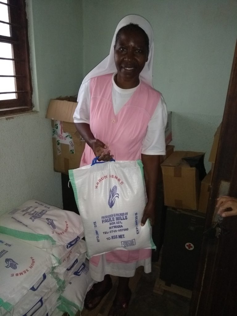Majengo is a district of Mtwara – not rich and no poorer than the rest of Mtwara. It is where the Sisters have for many years run a clinic and dispensary in a small building nestled under the large stone church. Alongside the dispensary and the blood and urine tests and apart from the doctors’ daily clinic, once a month, the Sisters distribute food to about two dozen of the most needy, older people in that community. Some of them are too ill or frail to walk to the dispensary and send neighbours or grandchildren, but each is known to the Sisters and each would be in grave danger of death without this help. Each month the Sisters are able to give to each older person 10 kg of maize flour and 2kg of beans. If the Sisters could afford to give away more food, they could easily find more people in need. The monthly cost of this service is £350.